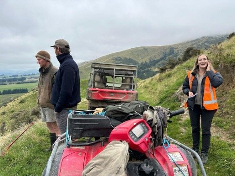 Aimee Hyland (Ekos Forever Forests) with Sam Lang (Groundshift) and farmer Mark Koopmans scoping potential production forestry and native regeneration carbon projects.