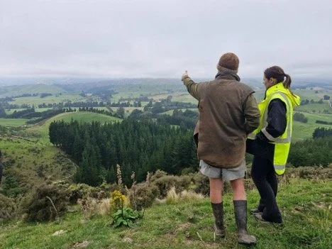 Farmer Mark Koopmans and Grace from Ekos Forever Forests discussing which land is best suited to plantation forestry vs native regeneration.