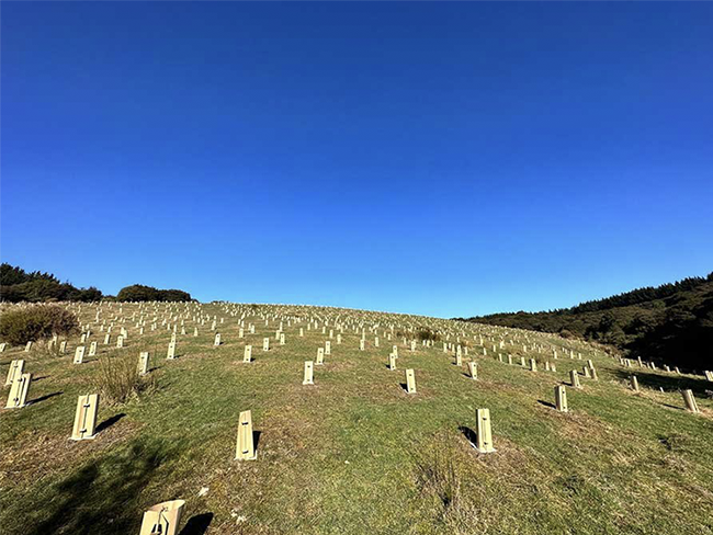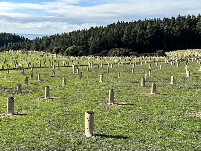 Growing trees as a permanent protected forest rather than for harvesting requires a different approach to planting. “We didn’t want regular rows and columns of trees, so we engaged local company Habitat Restorations Aotearoa, who specialises in conservation planting, to undertake contour planting of the rolling land” said Peter. The pasture has been separated into three areas using the existing fence lines. Planting will be undertaken in August and May each year, finally being completed in May 2026. Spreading planting over time reduces the risk of tree loss due to adverse weather and provides the necessary time for both the nurse trees and the Kauri to grow. As the Kauri grow, they will crowd out most of the nurse trees and dominate the forest.
