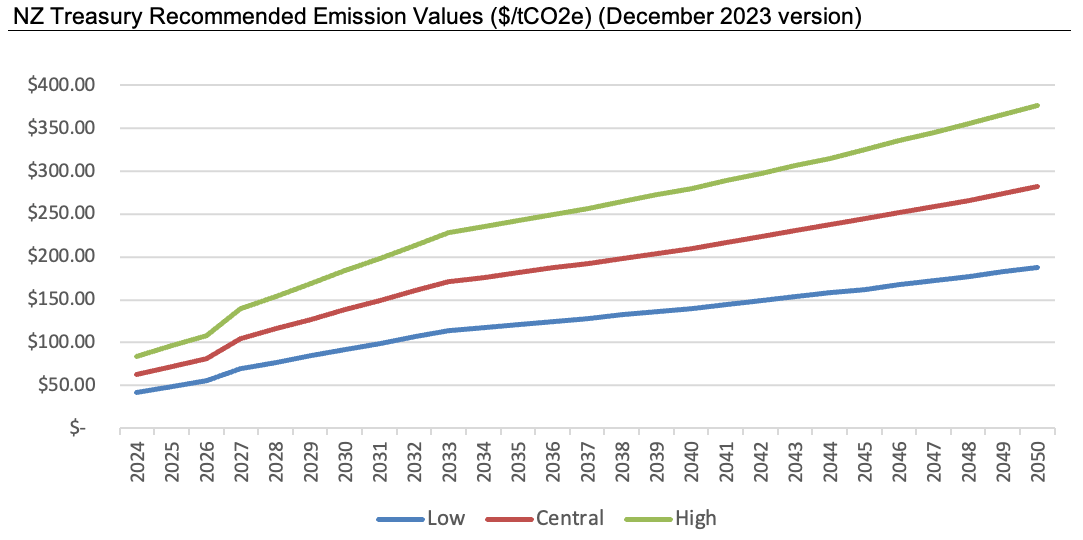 The cost of this damage to society can be calculated - the 'Social Cost of Carbon'. The New Zealand Treasury calculates this in the form of the 'Recommended Emission Values' that it publishes at the end of each year (see the graph below).