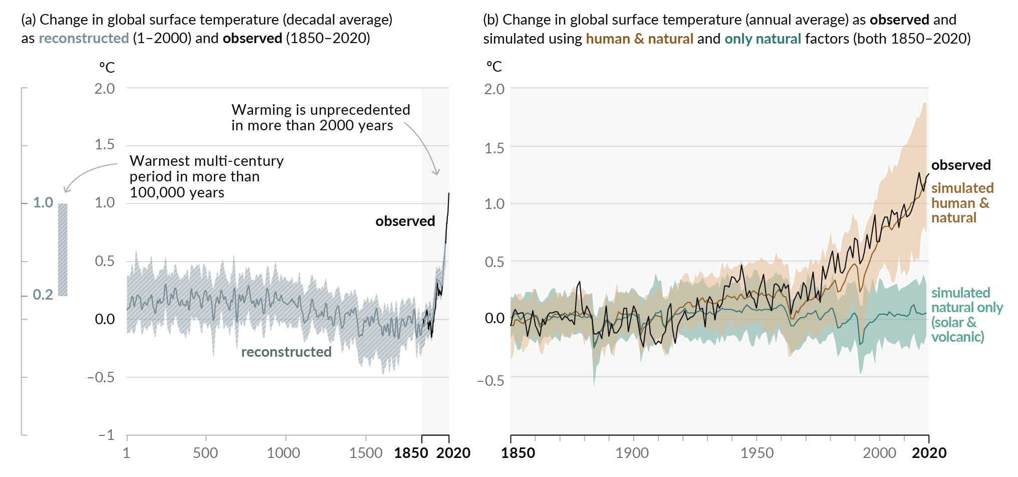 Human influence has warmed the climate at a rate that is unprecedented in at least the last 2,000 years.